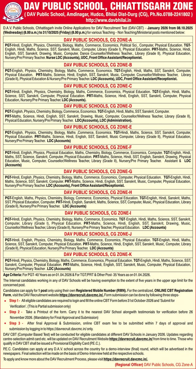 DAV PUBLIC SCHOOL CHHATTISGARH ZONE VACANCY POSITION 2026-27
